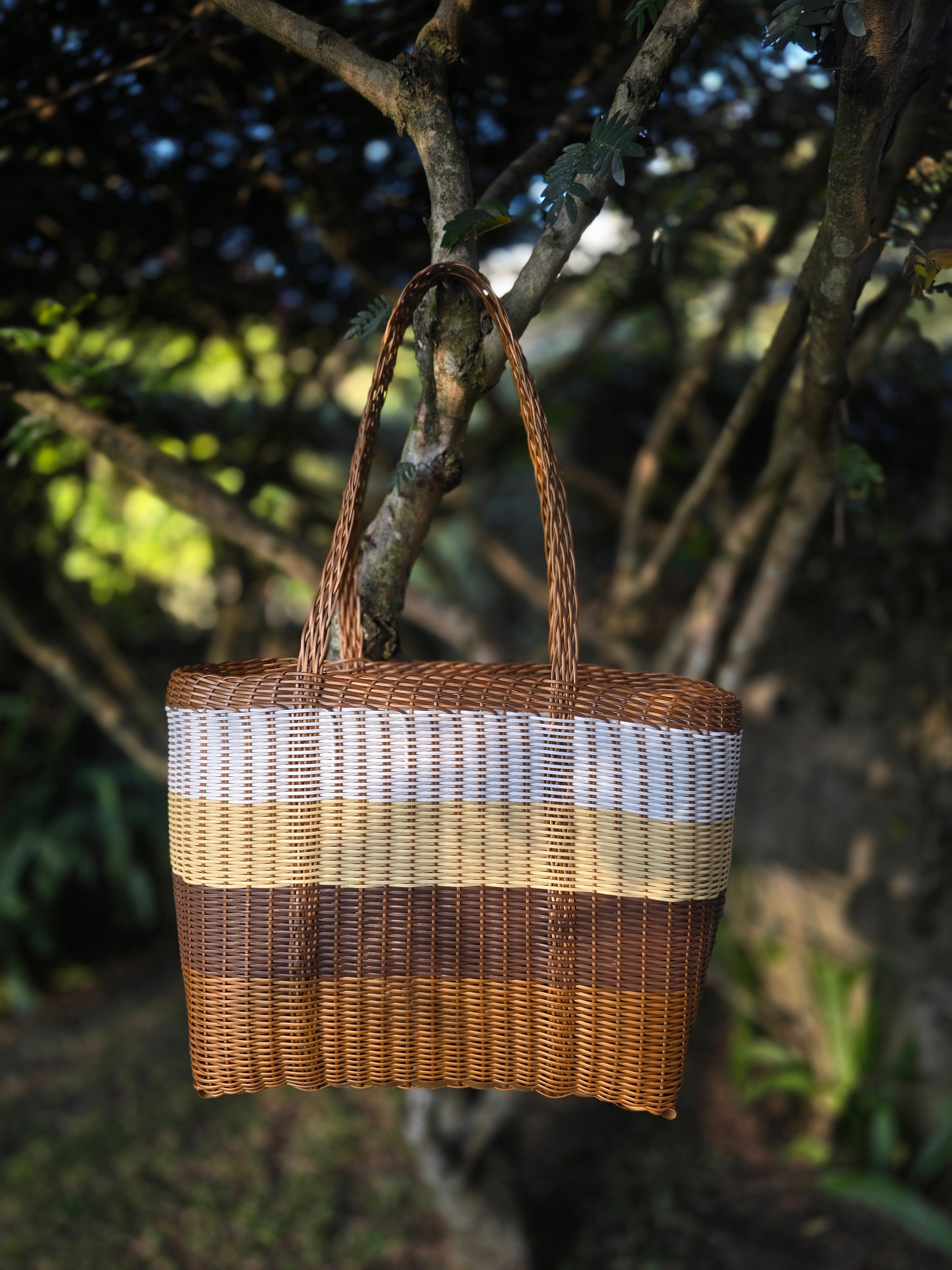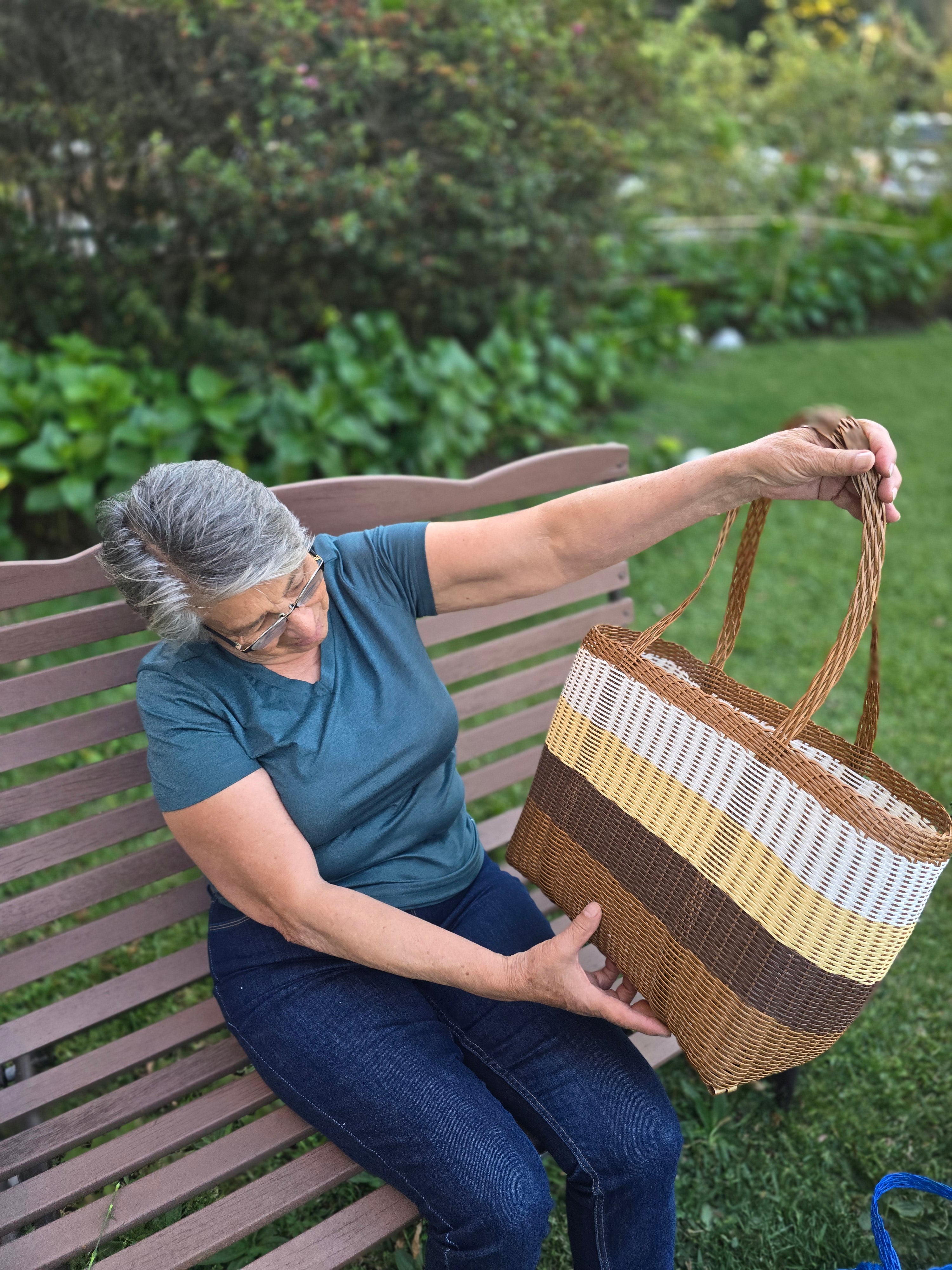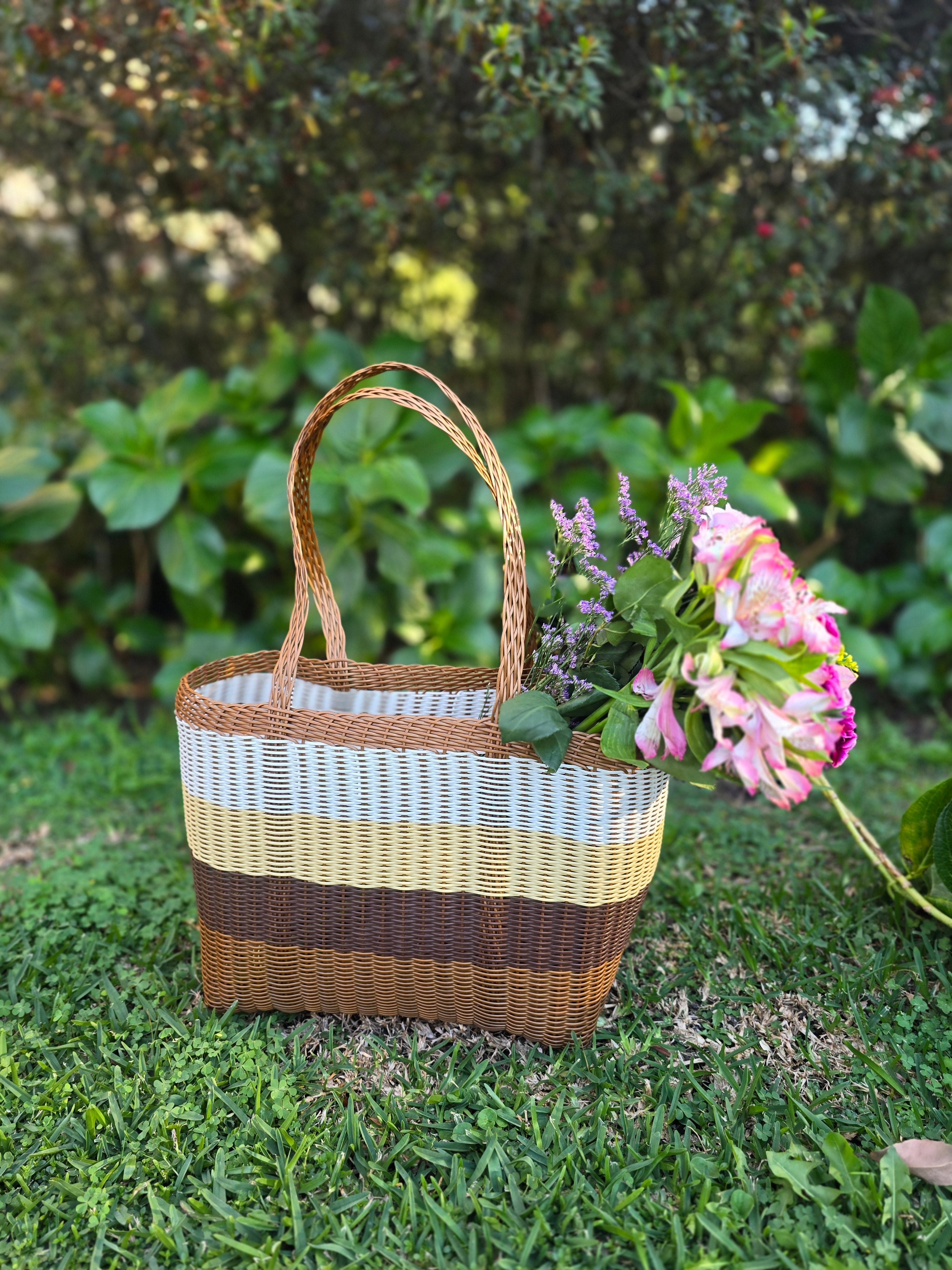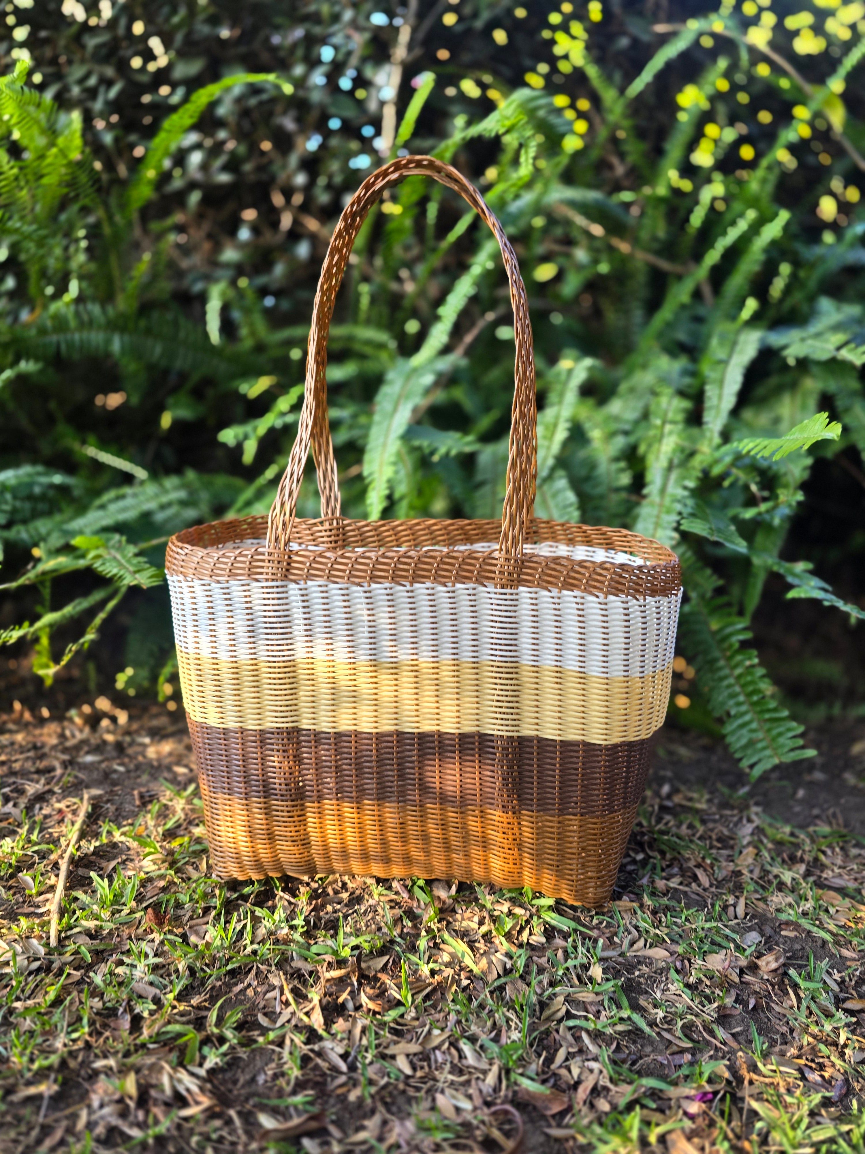Embrace a timeless, natural aesthetic with this handwoven plastic market tote. Featuring a sophisticated palette of chocolate brown, tan, mustard, and cream, this bag offers the rustic look of a traditional basket with the indestructible benefits of modern materials. Whether it's for a weekend farmers' market run or heavy-duty daily use, this tote is built to perform.