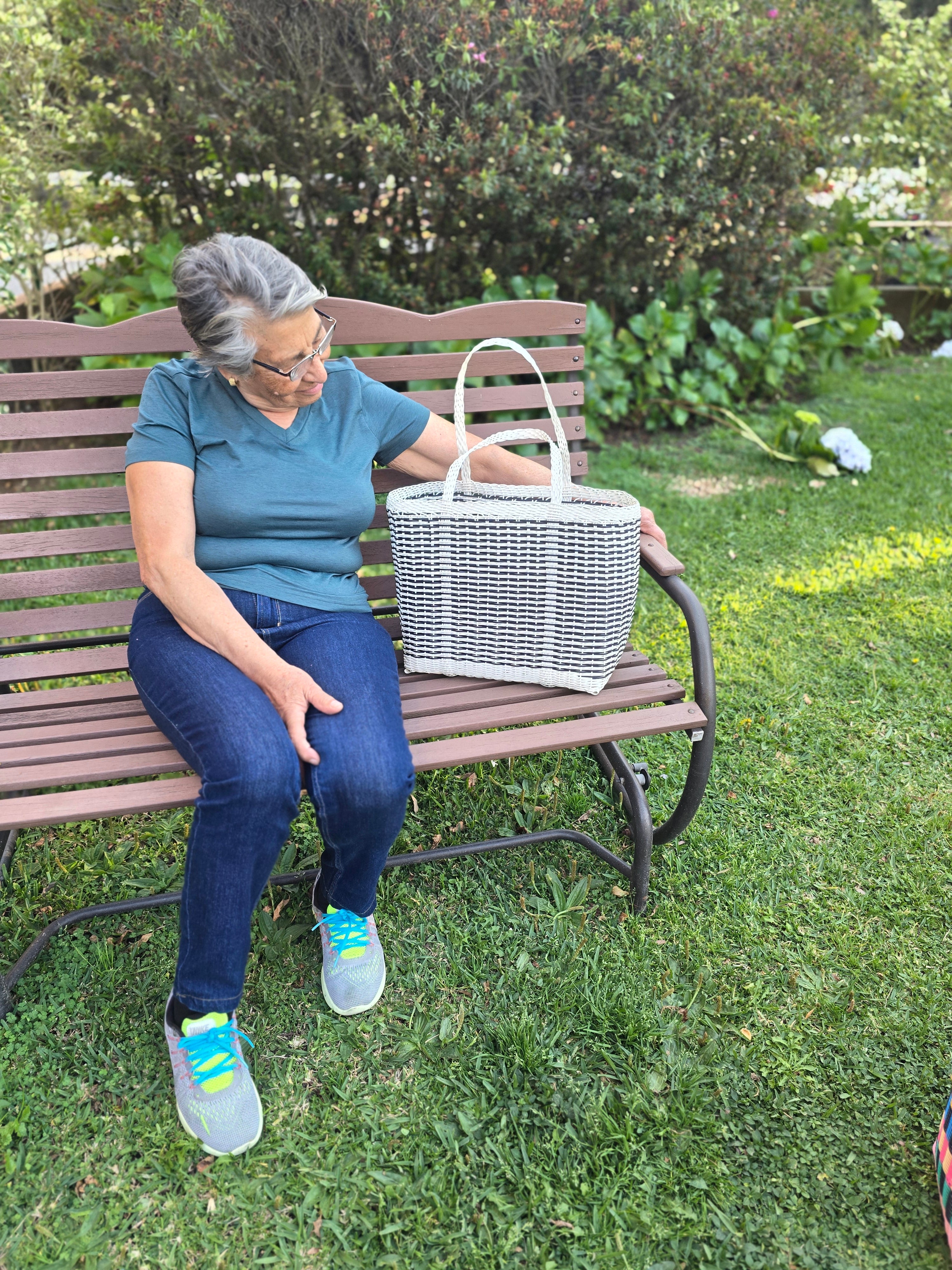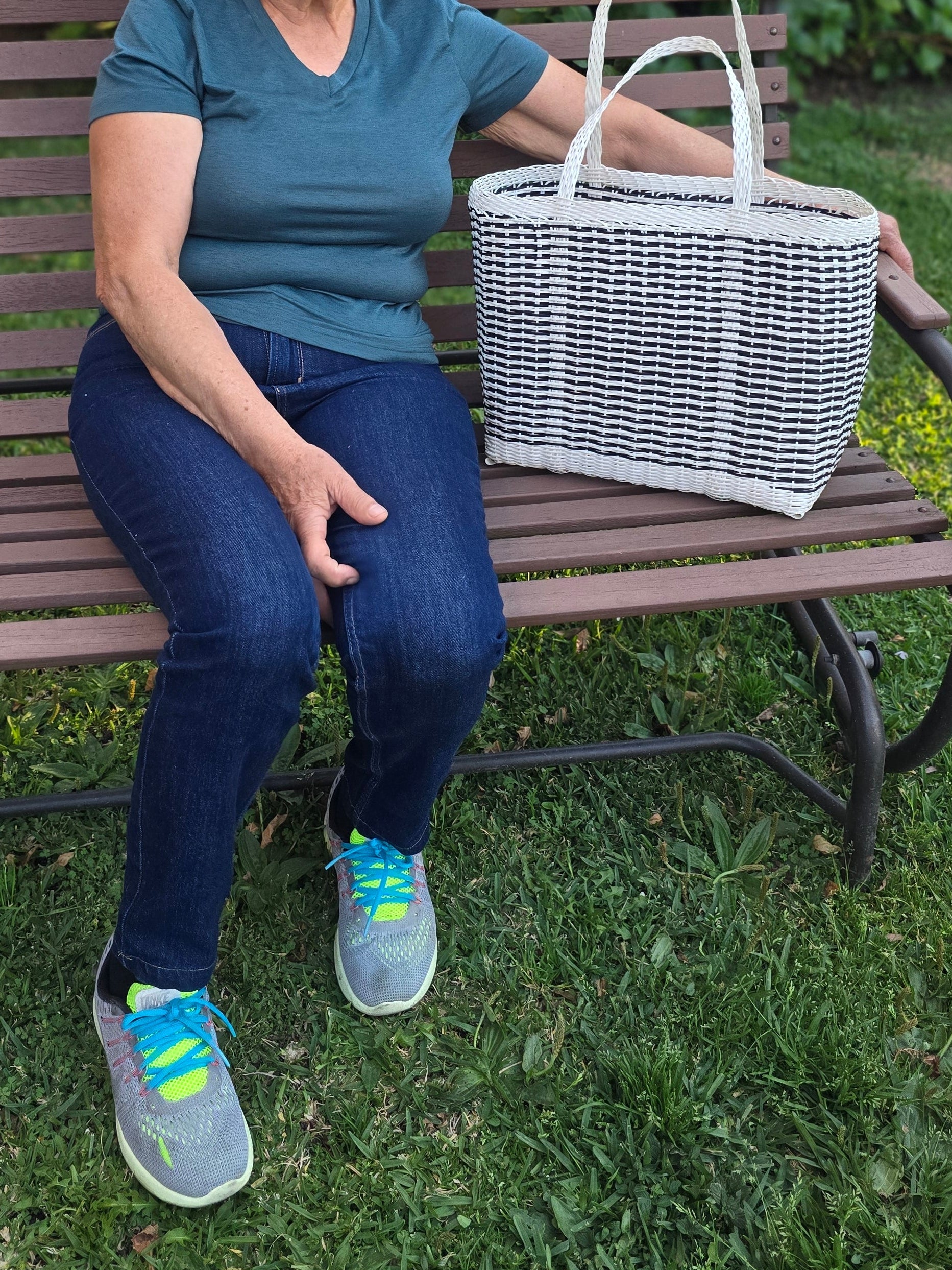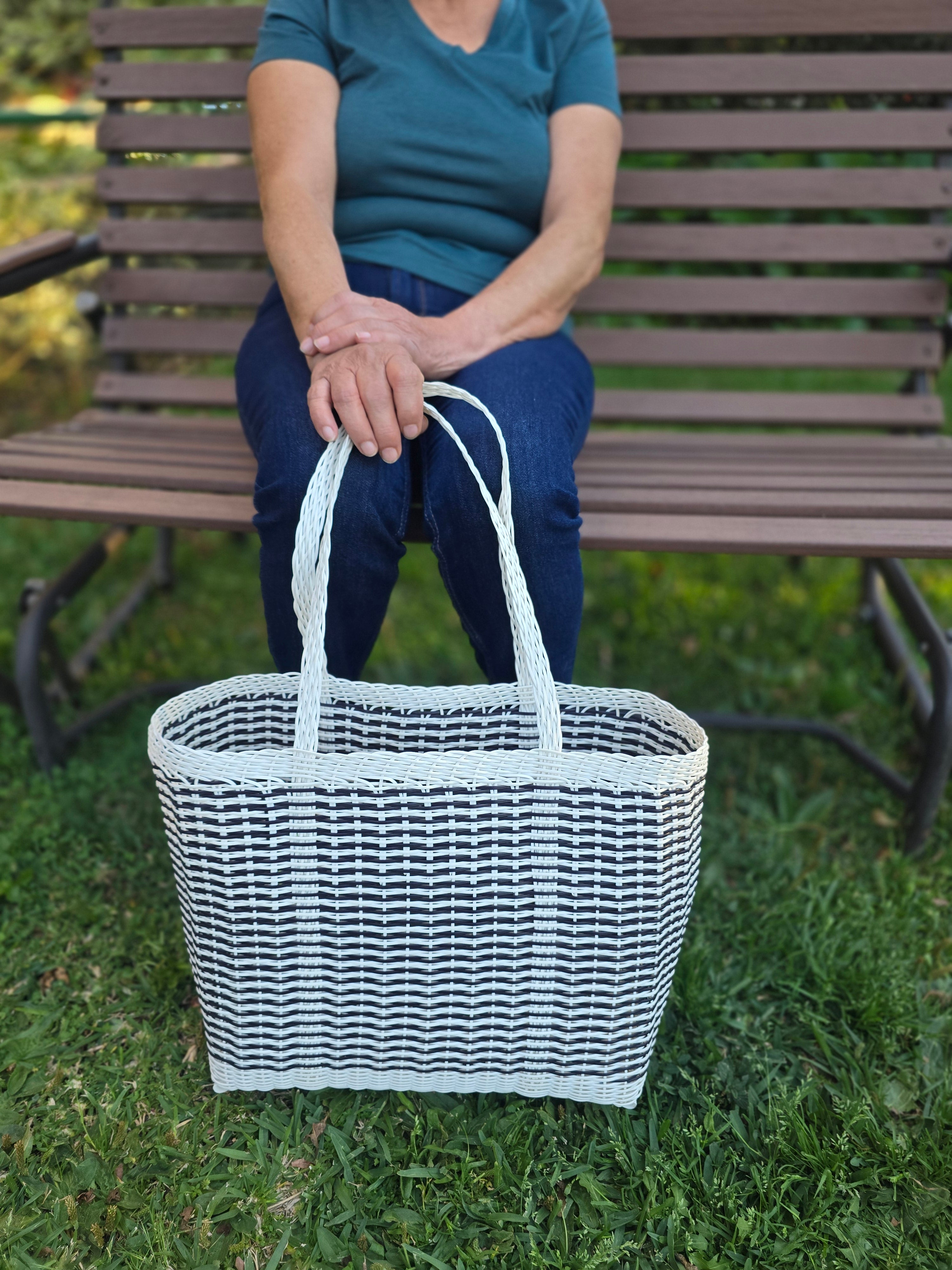 Function meets fashion with this large, black and white woven tote. Handmade by artisans in Guatemala using durable, recycled plastic, it's designed for life on the go. Its generously spacious interior easily handles groceries, beach towels, picnic supplies, or all the gear for your kids' sports games. Built to last and fully washable, this versatile bag is a reliable companion for any activity.
