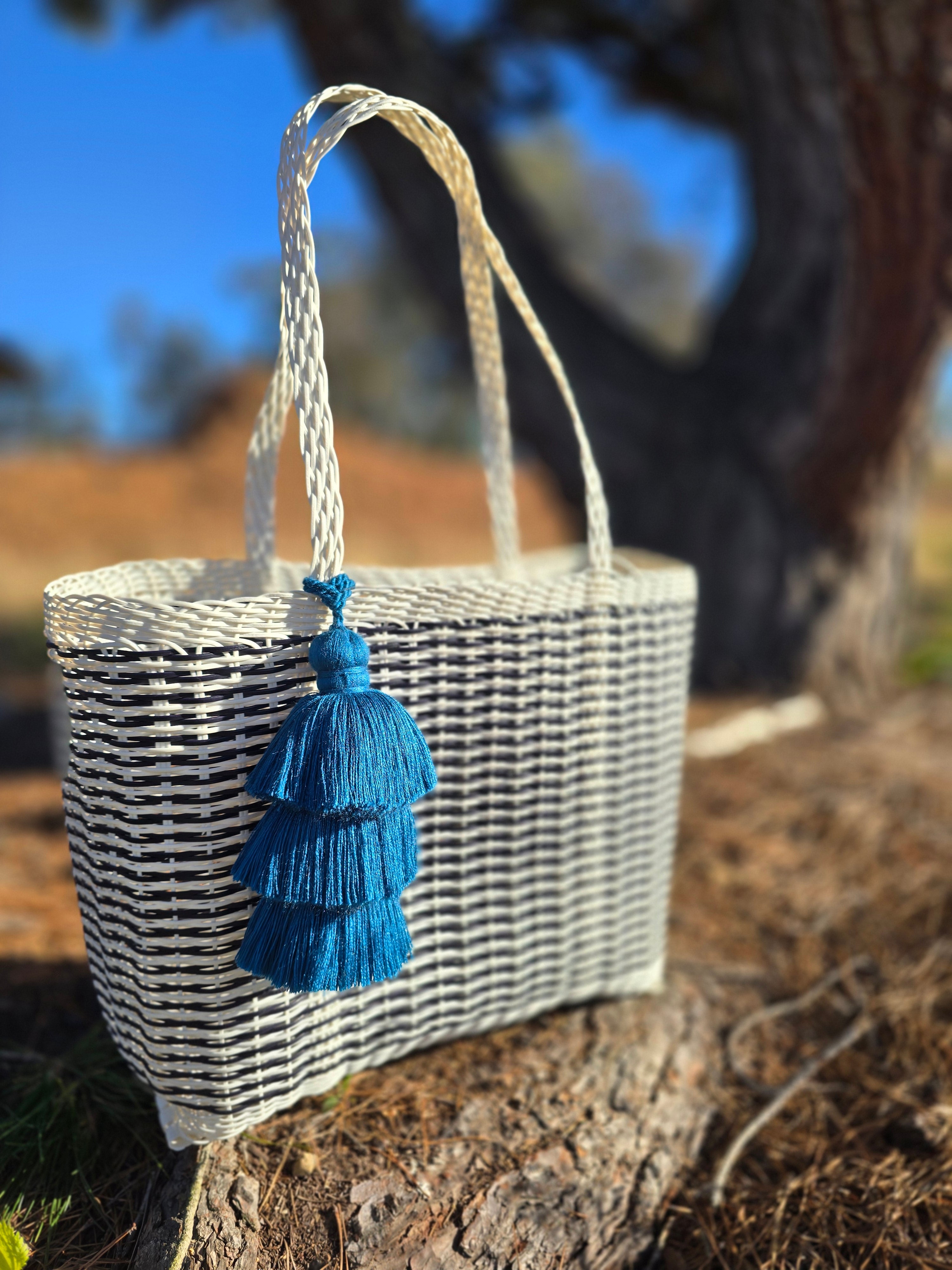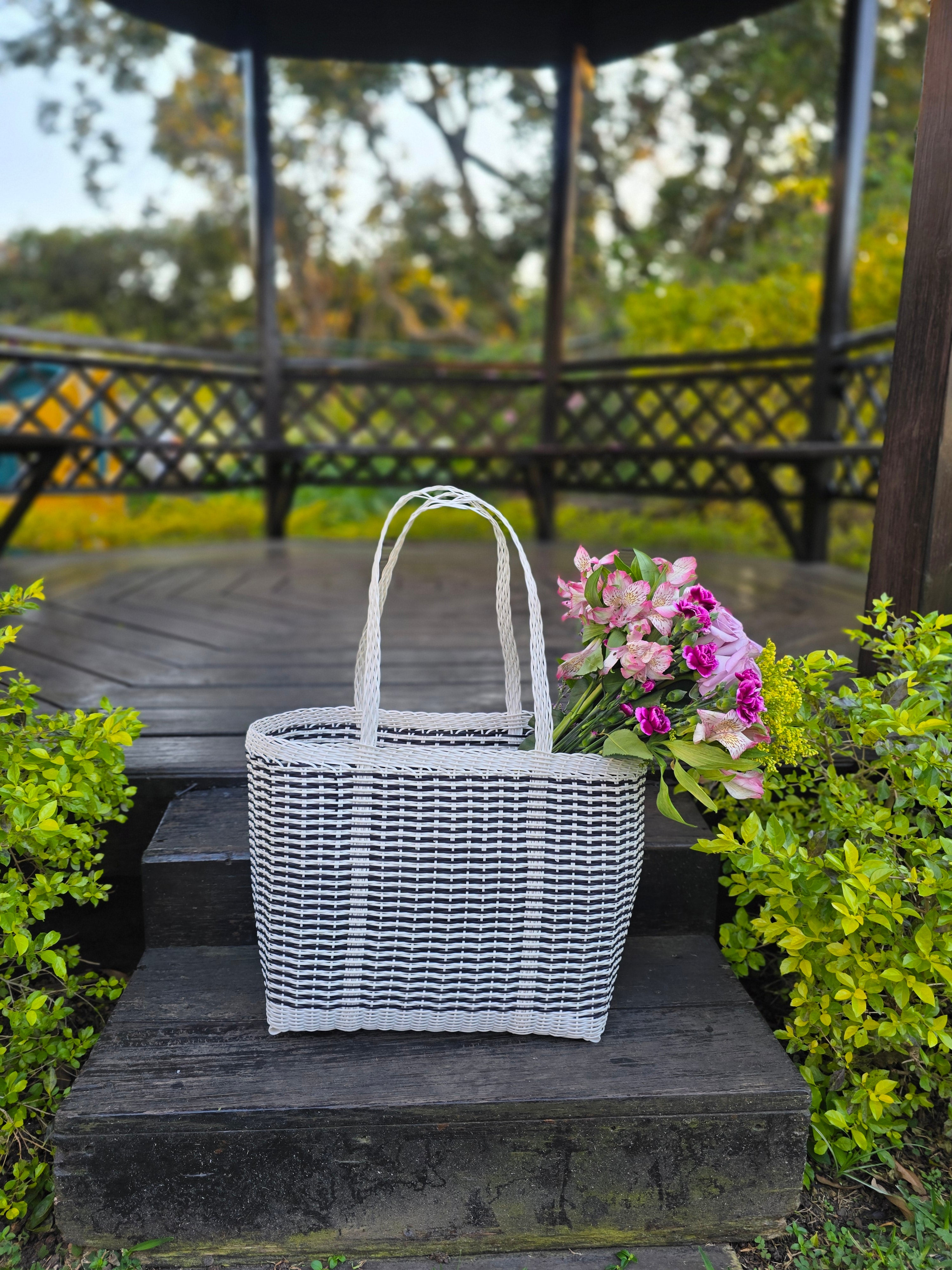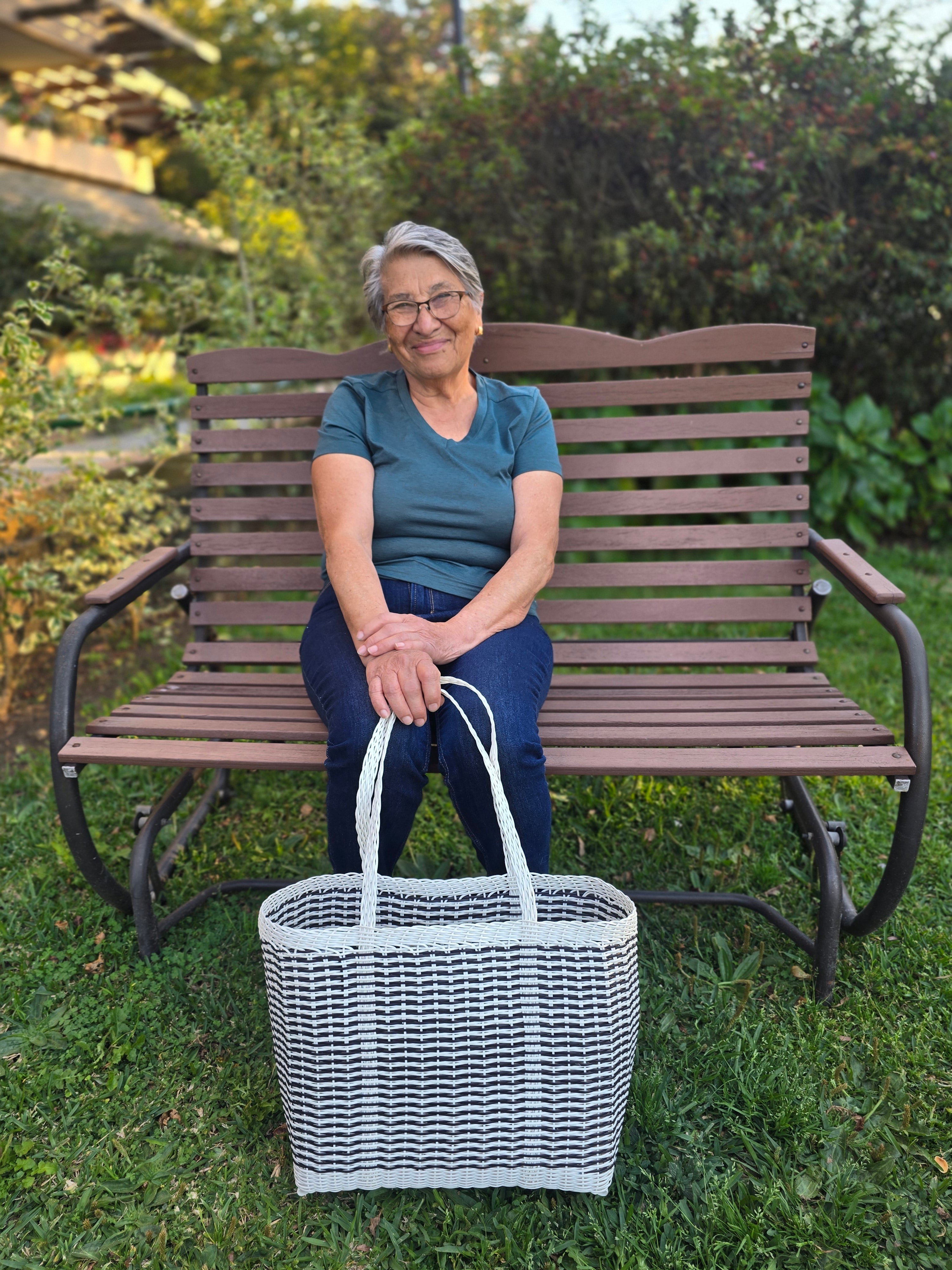 Function meets fashion with this large, black and white woven tote. Handmade by artisans in Guatemala using durable, recycled plastic, it's designed for life on the go. Its generously spacious interior easily handles groceries, beach towels, picnic supplies, or all the gear for your kids' sports games. Built to last and fully washable, this versatile bag is a reliable companion for any activity.