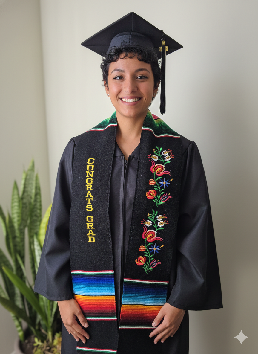 Celebrate your graduation with our stunning Black Sarape Fabric Graduation Stole adorned with vibrant Blue, Orange, and Green Multicolor Flowers. This beautifully handcrafted stole is perfect for Class of 2025 graduates who want to showcase their Mexican heritage in style.