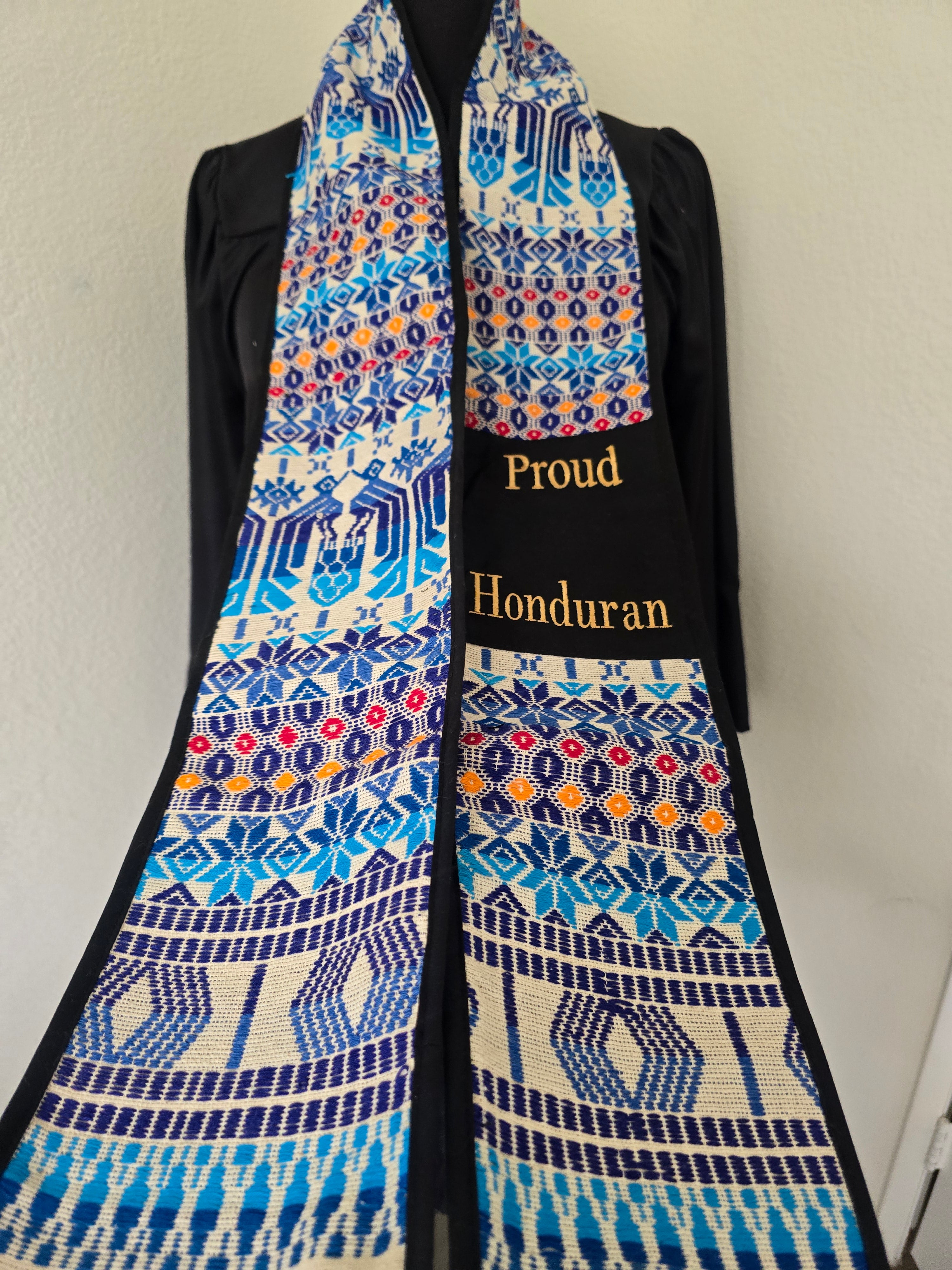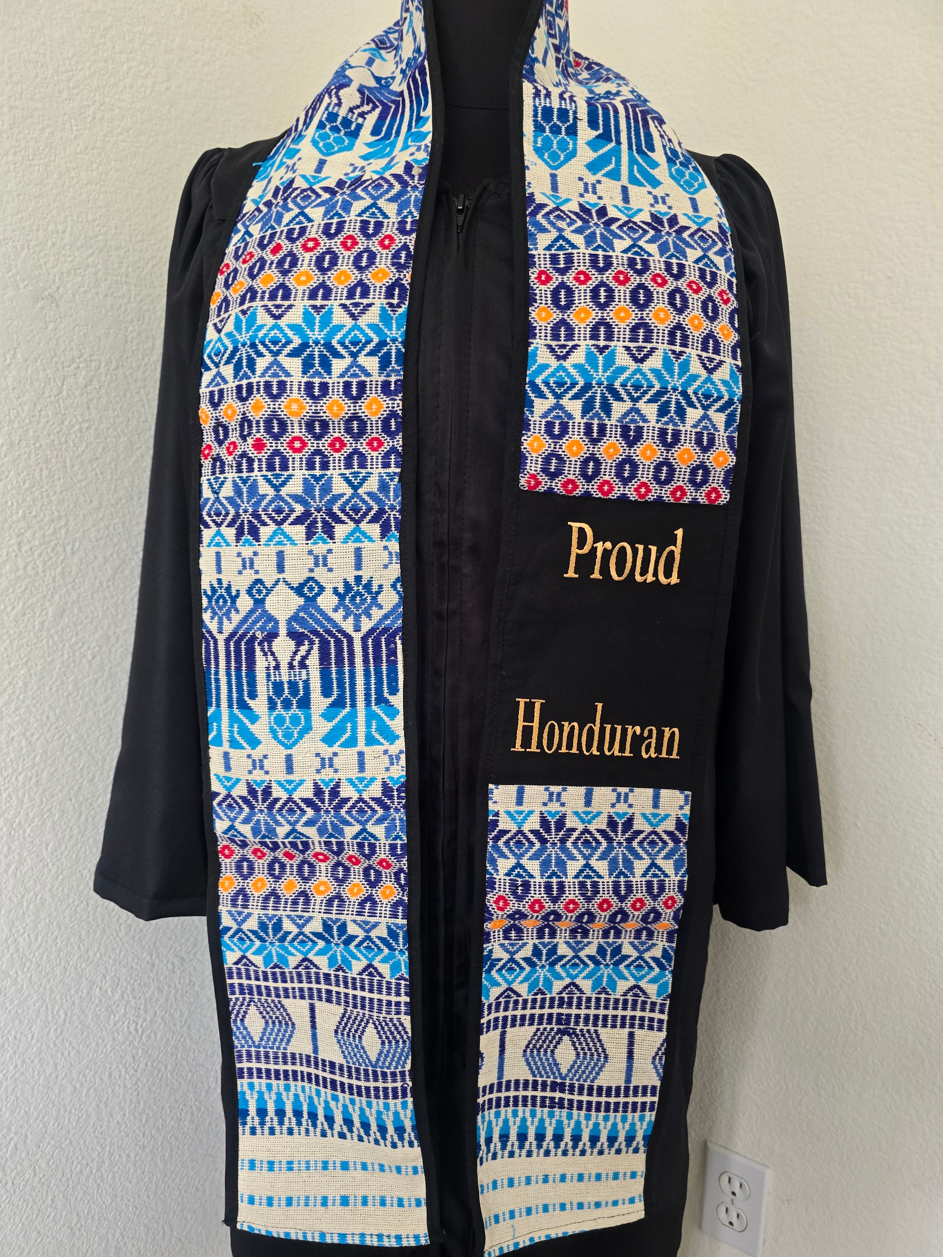 Celebrate your academic achievements with pride and elegance wearing this unique, hand-woven graduation sash. Crafted in Totonicapan, Guatemala, this exquisite piece showcases a beautiful blue bird design, symbolizing your cherished connection to Honduras. Each sash is a testament to the artistry and tradition of Mayan wavers craftsmanship, ensuring you stand out on your special day.