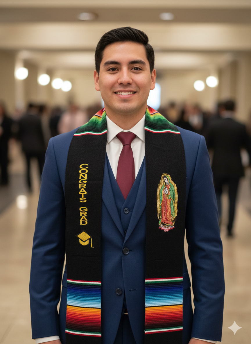 Celebrate your academic achievements with our stunning Virgen de Guadalupe Graduation Sash! Handcrafted with vibrant, traditional sarape fabric, this sash is a beautiful blend of cultural heritage and modern celebration.